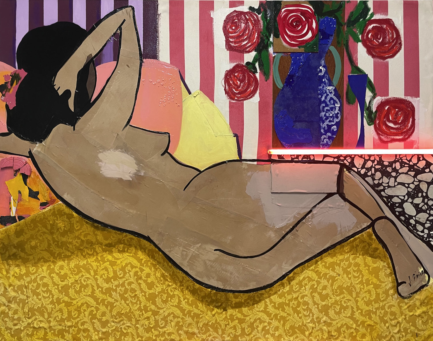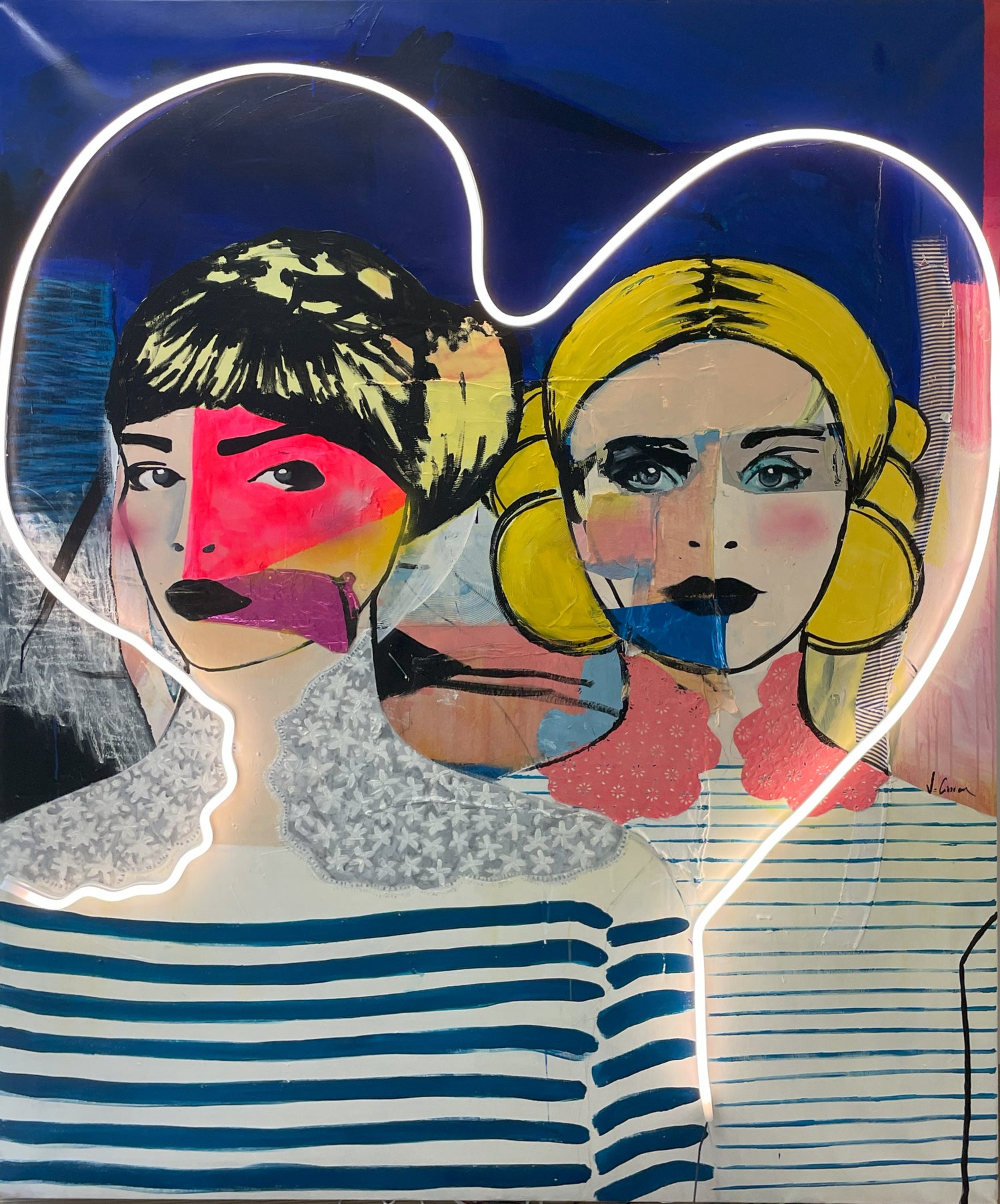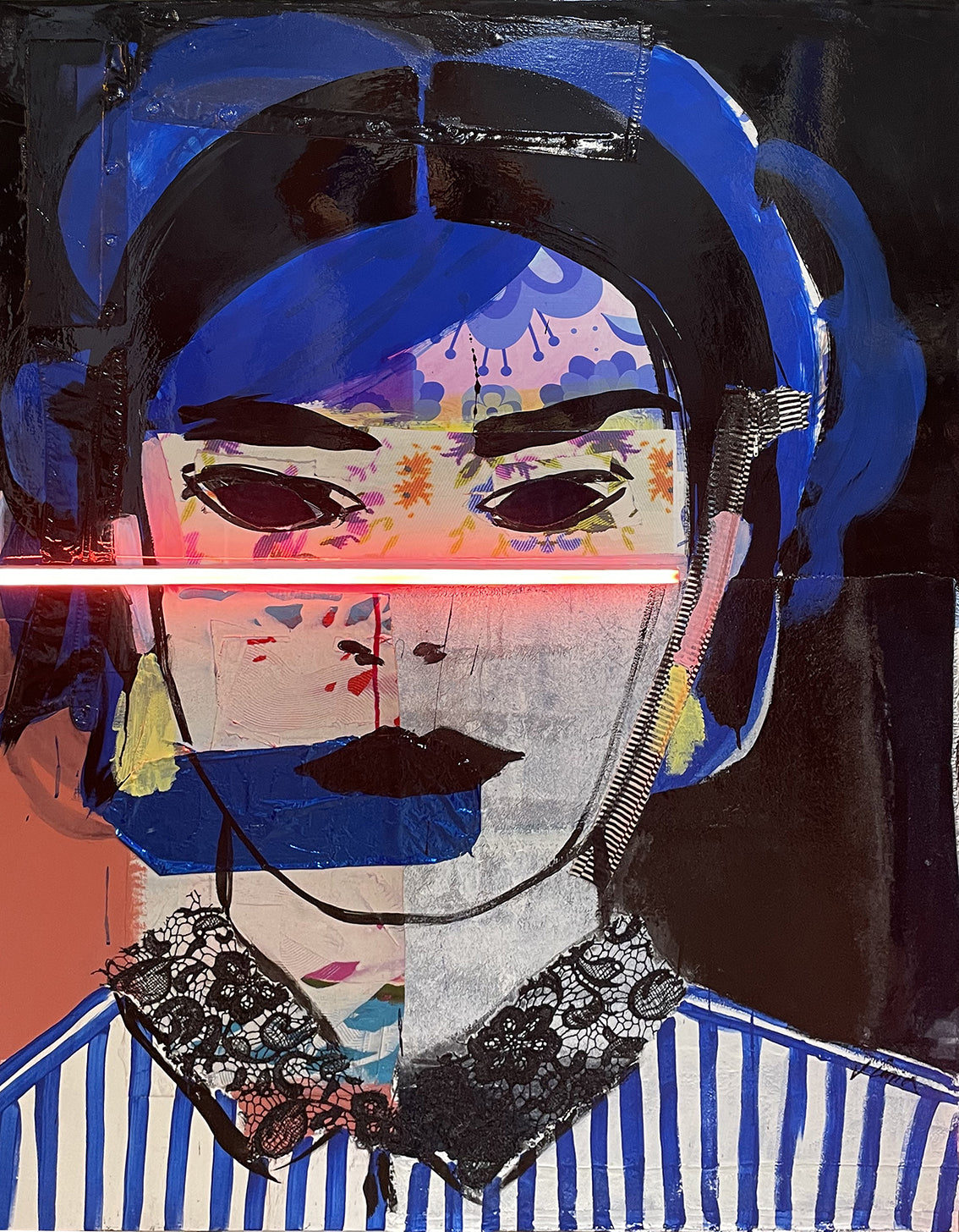 Her works develop through layered processes. Papers, textiles, lace, wood and reclaimed materials merge with acrylic, ink and oil pastel. When present, the LED neon line functions as a luminous fracture, exposing, outlining and intensifying the image.