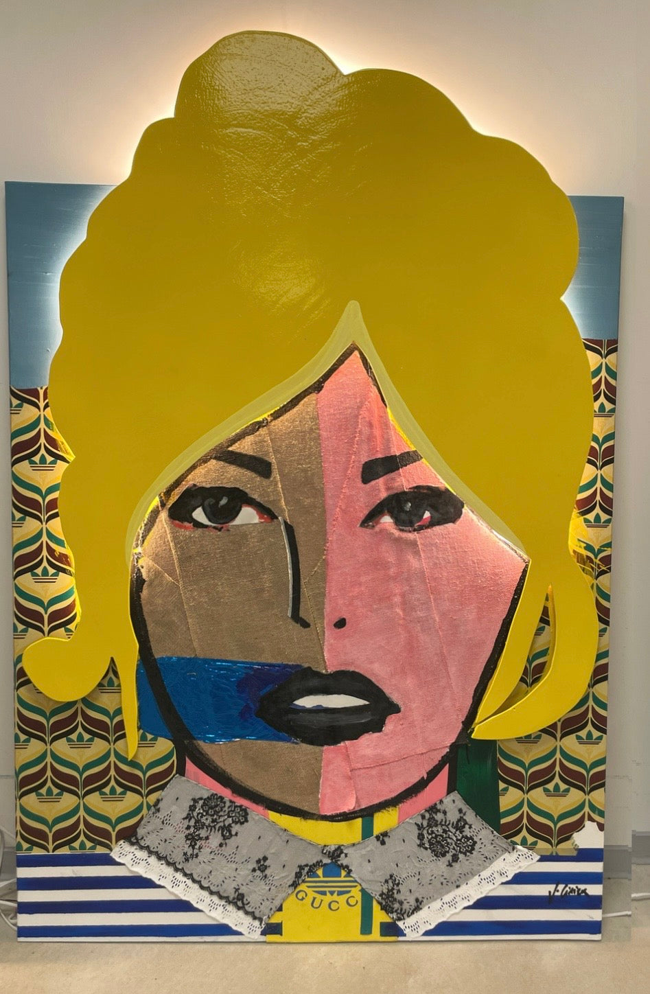 La chevelure en contreplaqué peint et rétroéclairé s'impose lumineuse, tandis que le fond graphique aux motifs récupérés et aux couleurs vintages dialogue avec le visage fragmenté et stylisé.