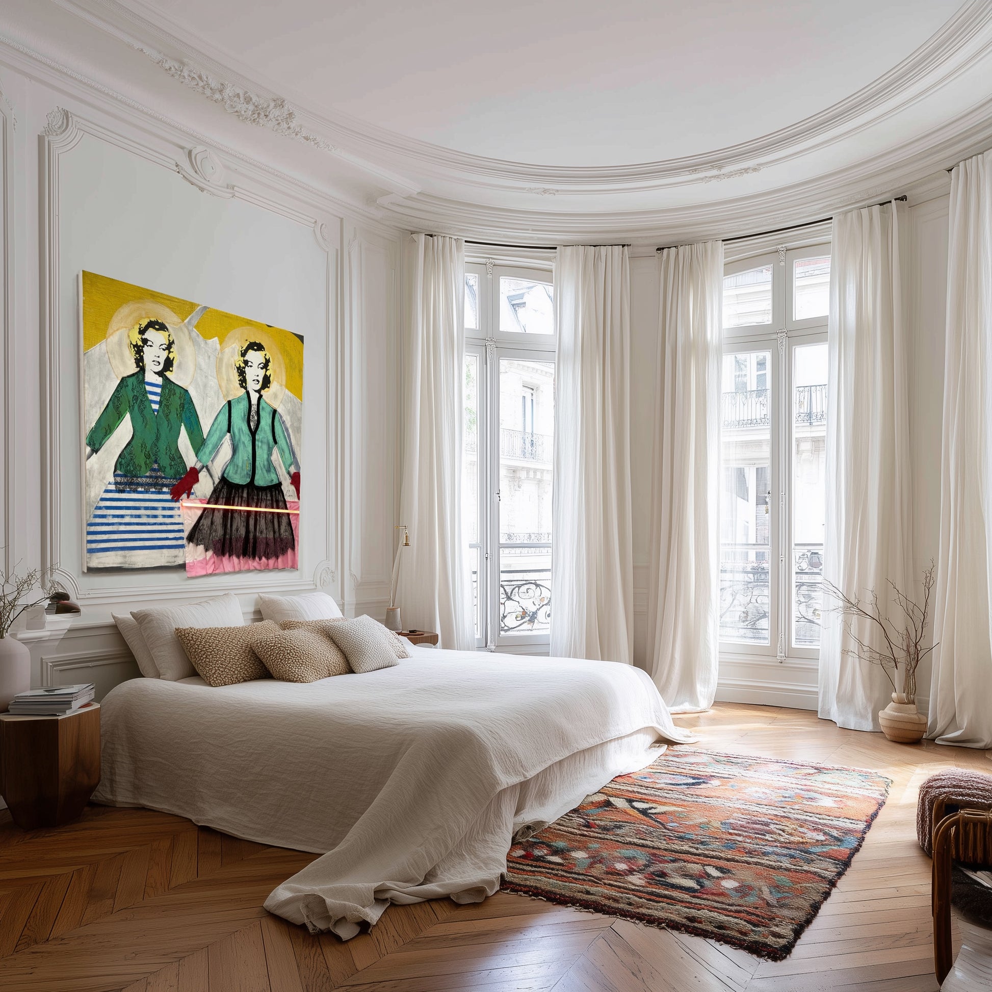 Cette œuvre est née de mon désir de transposer la symbolique du tableau Les Deux Fridas de Frida Kahlo à la figure de Marilyn Monroe. Comme Frida, Marilyn porte en elle une dualité profonde : celle que l’on expose au monde et celle qui existe dans l’intimité.