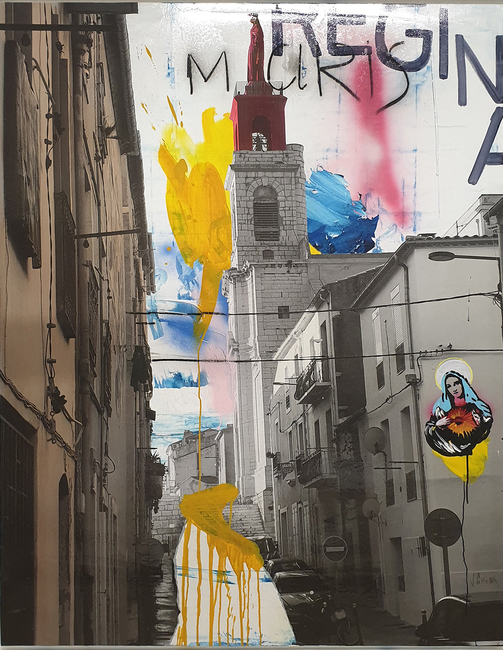Vue emblématique de la Décanale Saint-Louis à Sète, revisitée en collage urbain. La photographie en noir et blanc sert d’ossature au paysage, bousculée par des éclats de couleur — acrylique, coulures franches, gestes bruts. Une figure iconique surgit sur la façade comme un clin d’œil sacré-profané.